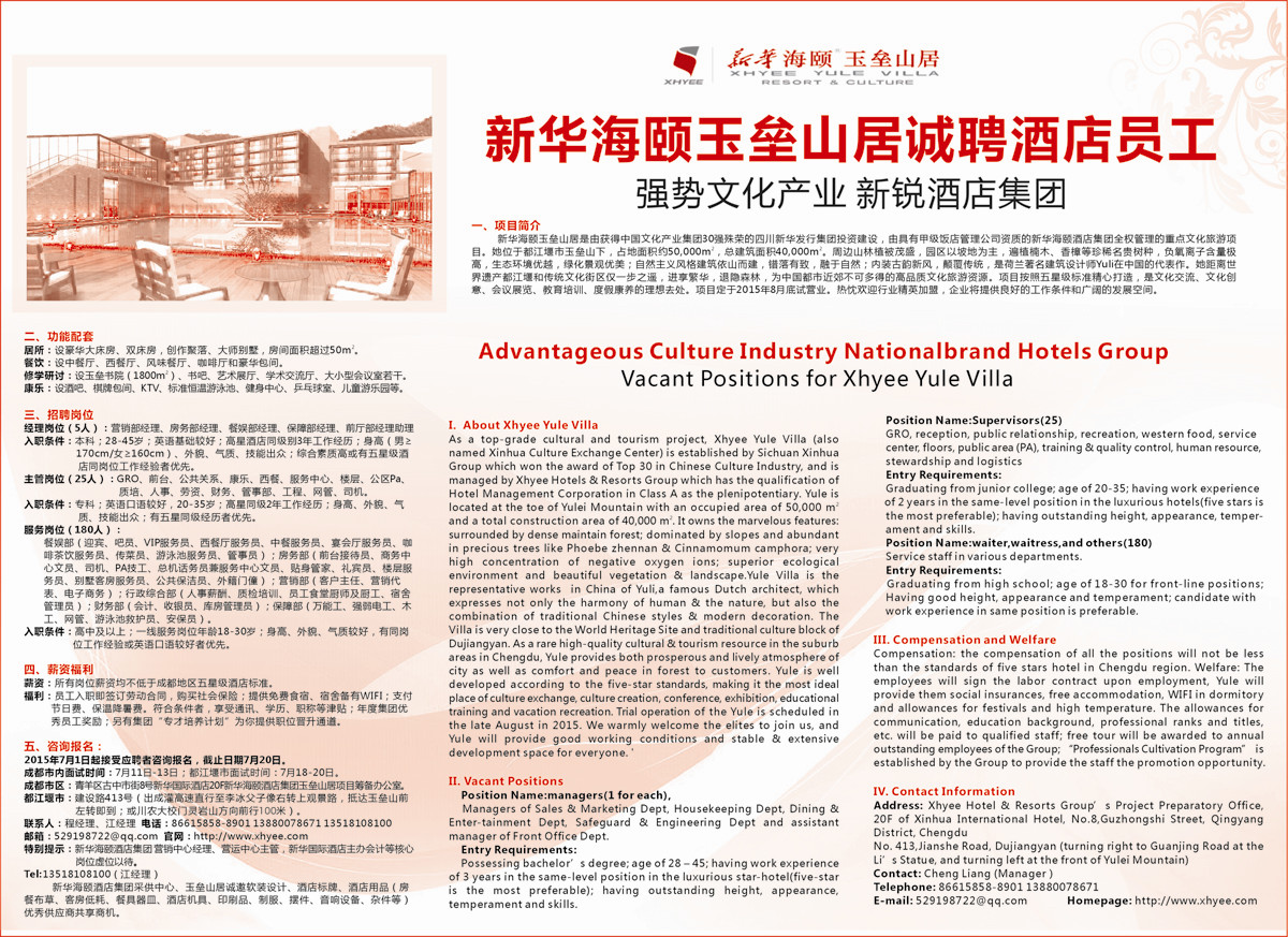 梧桐萋萋?鳳凰來兮?新華海頤御壘山居誠聘酒店員工