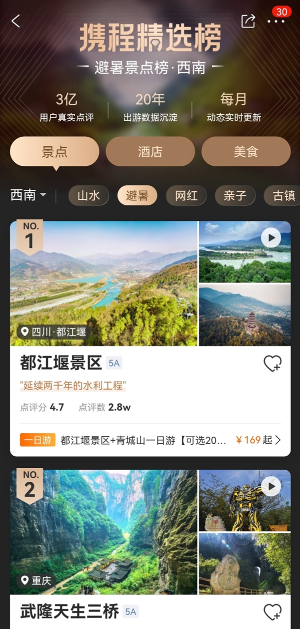 攜程西南地區熱門避暑景點榜。