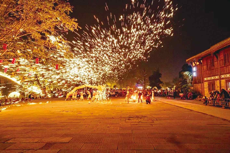 正月十五元宵夜,四川成都雙流區黃龍溪古鎮景區,飛濺的鐵花點亮夜空,歡呼的聲音響徹云霄,“火龍燈舞”和“府河號子”兩大非物質文化遺產項目輪番上演,游客在“煙火游龍”營造的濃郁年味中互致問候,給兔年春節畫上一個絢麗句號。