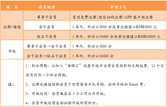 3、“海頤匯”會(huì)員無須繳付年費(fèi),會(huì)員資格長期有效。“海頤匯”會(huì)員分為三個(gè)級(jí)別,分別是海頤匯普卡(尊享卡)會(huì)員、海頤匯金卡會(huì)員、海頤匯鉆石卡會(huì)員。