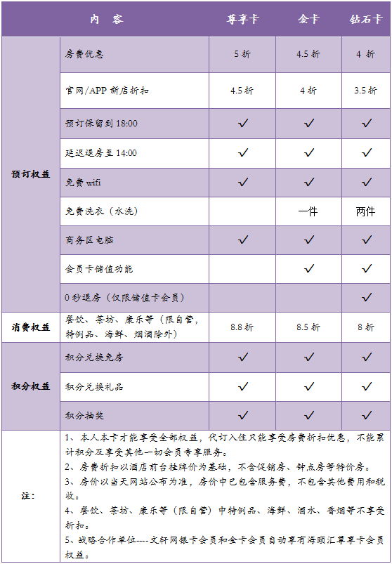 4、“海頤匯”會(huì)員本人持會(huì)員卡,并以會(huì)員價(jià)入住新華海頤酒店集團(tuán)旗下酒店,均可以按照相應(yīng)會(huì)員等級(jí)的積分比例獲得積分,累計(jì)積分只針對(duì)新華海頤酒店房費(fèi)部分。